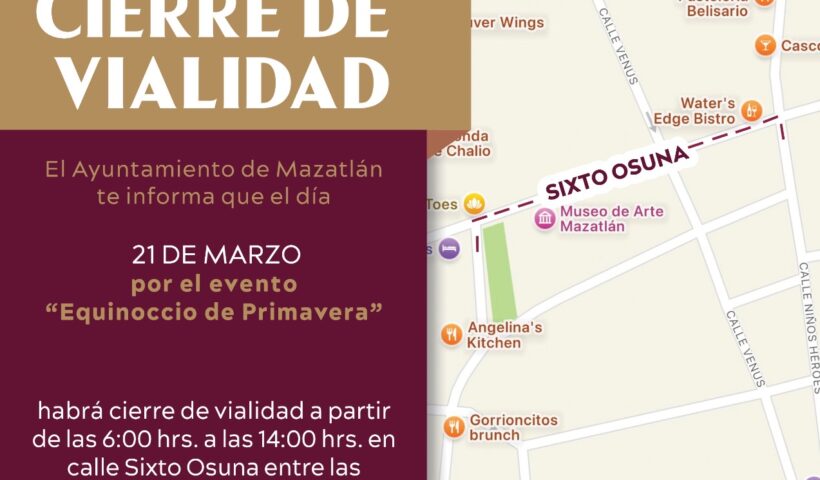 Mazatlán, Sinaloa, 20 de marzo de 2025.- El Gobierno Municipal de Mazatlán anuncia el cierre parcial de una vialidad de la zona Centro, con motivo…