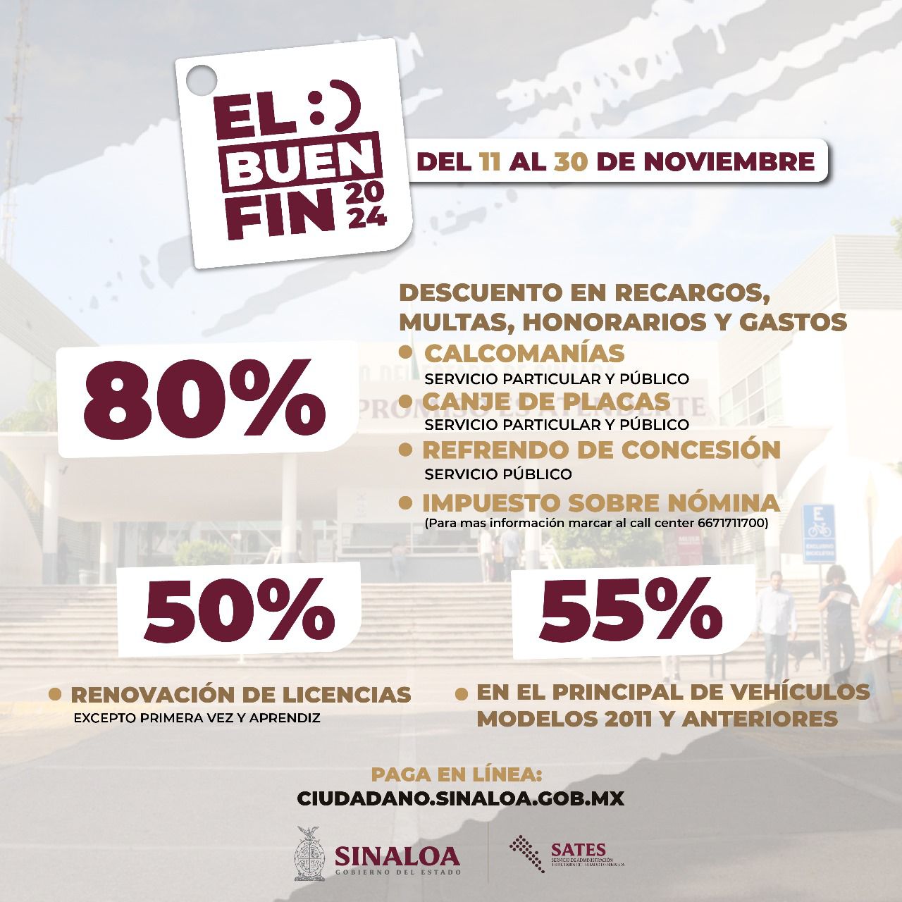 El Buen Fin 2024 será del 11 al 30 de noviembre del presente año. Se estará laborando en todas las oficinas de Recaudación del Estado, incluyendo sábados y domingos, con un horario de atención de 8 am a 3 pm, excepto el domingo 24 de noviembre.