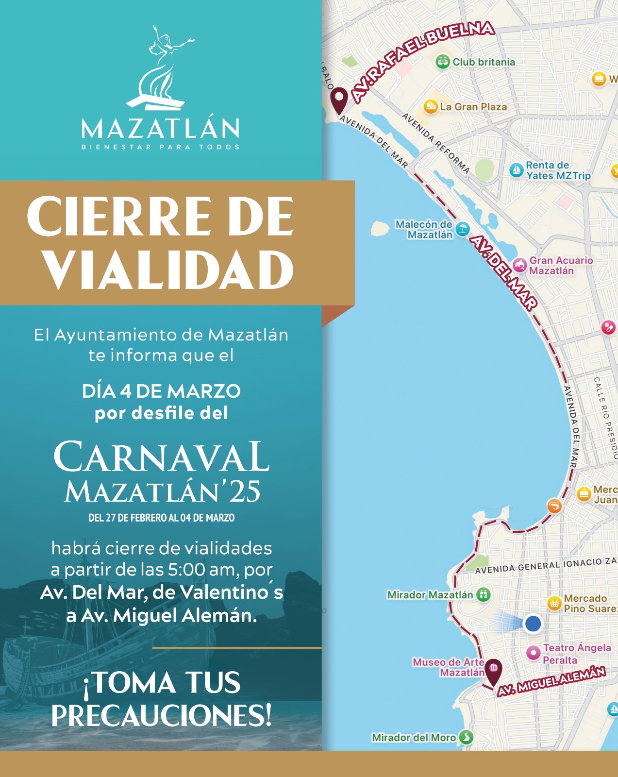 Mazatlán, Sinaloa, 3 de marzo de 2025.– Para el segundo y último desfile del Carnaval Internacional Mazatlán 2025, “La Perla”, la Secretaría de Seguridad Pública Municipal, a través de la Subdirección de Tránsito, informa del cierre de vialidad de la avenida Del Mar, mañana martes 4 de marzo, a partir de las 05:00 horas.