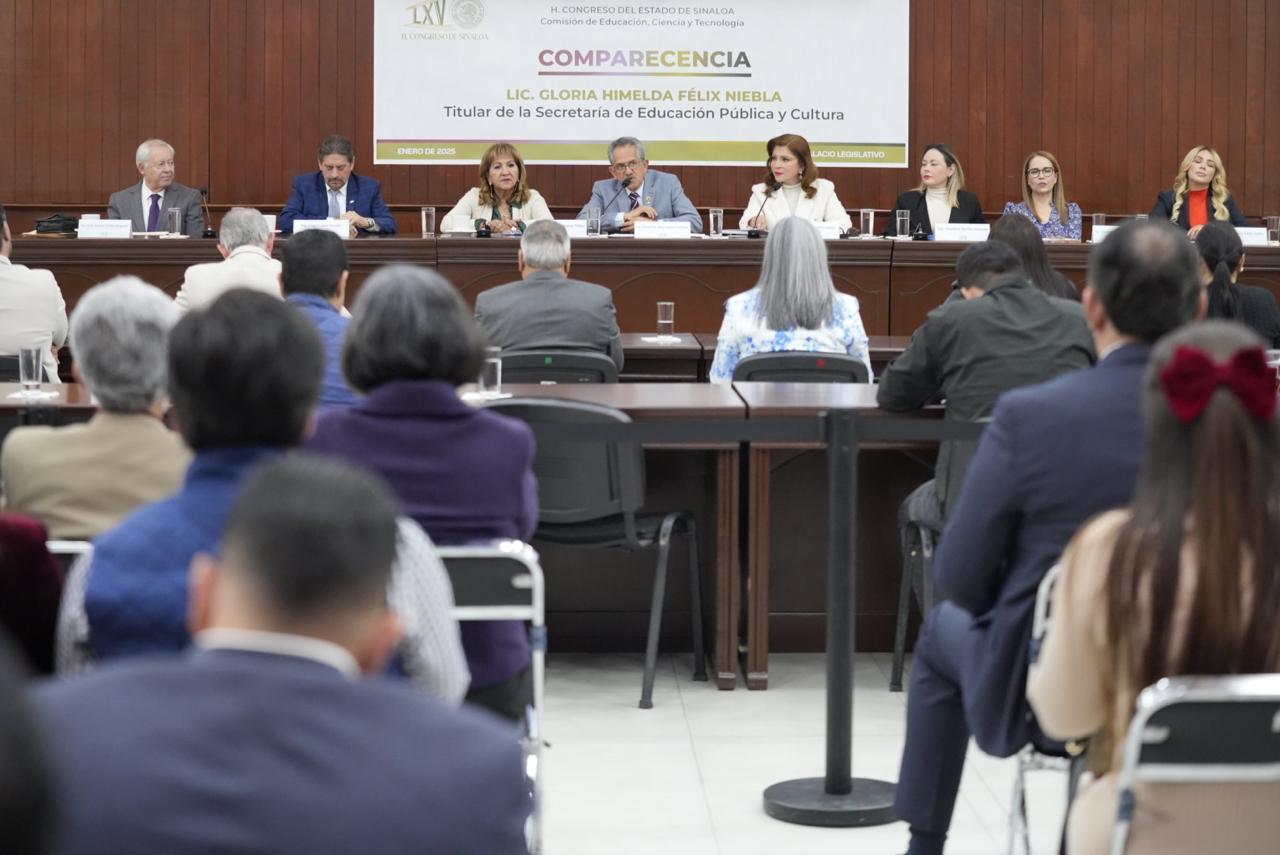 La comparecencia de la titular de la Secretaría de Educación Pública y Cultura, Gloria Himelda Félix Niebla, fue encabezada por las y los integrantes de la Comisión de Educación, Ciencia y Tecnología del Congreso del Estado, y las diputadas María Teresa Guerra Ochoa y Yeraldine Bonilla Valverde, presidentas de la Junta de Coordinación Política y de la Mesa Directiva del Congreso del Estado.