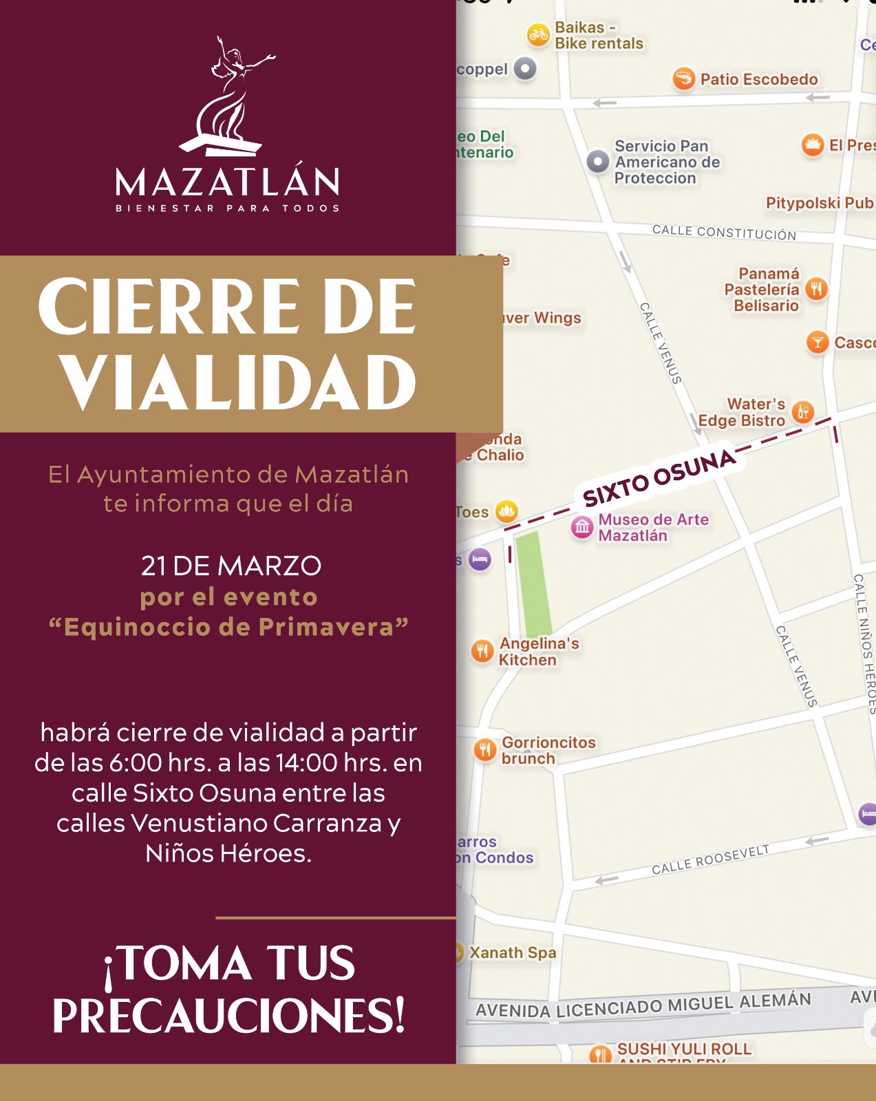 Mazatlán, Sinaloa, 20 de marzo de 2025.- El Gobierno Municipal de Mazatlán anuncia el cierre parcial de una vialidad de la zona Centro, con motivo del acto de recepción del Equinoccio de Primavera.