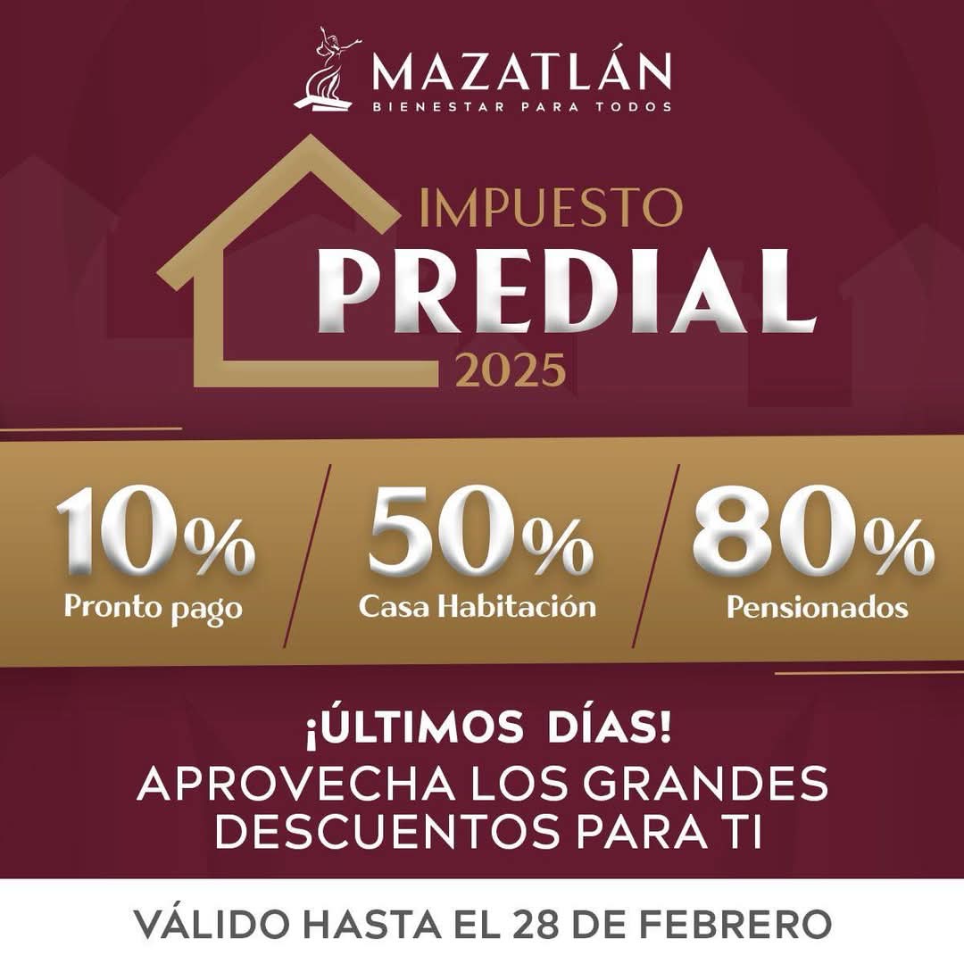 Mazatlán, Sinaloa, 21 de febrero de 2025.- La Dirección de Ingresos del Gobierno Municipal, hace un llamado a los contribuyentes que todavía no se han actualizado en el pago del Impuesto Predial correspondiente al año 2025, que aprovechen los descuentos del 10 % por pronto pago, 50 % en casa-habitación y 80 % a pensionados, programa que ya concluye este viernes 28 de febrero.